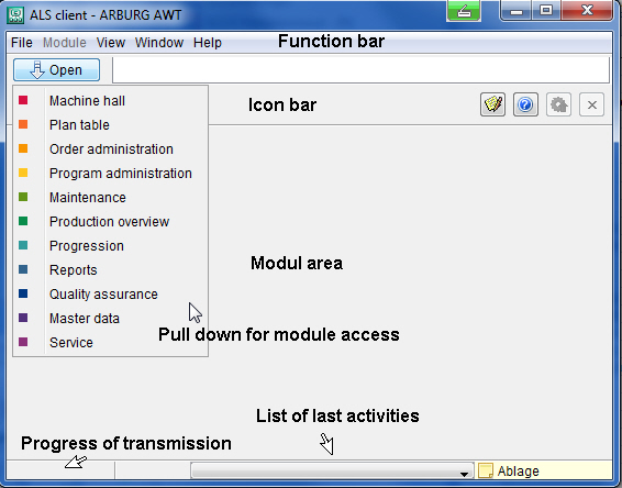 The ARBURG Host Computer System (ALS) consists of modules (software programs which cover the various task requirements), and of ALS Clients which provide access to the data and functions of ALS. An ALS Client is an autonomous program whose files are generally located locally on the computer on which it is started. The ALS modules are located centrally on a server. The modules and clients communicate with each other through the network.